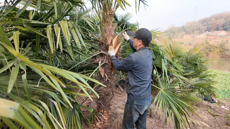 成林棕树产量高、收益好,采收期从每年7月延续至次年3月,大半年的采摘期稳稳锁住这份好收益。
