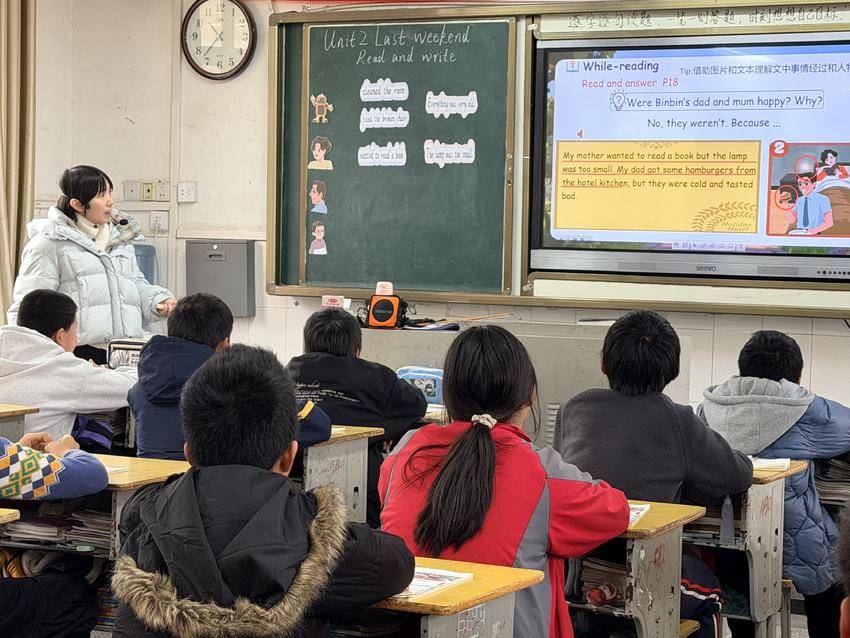 英语课堂上,党员教师张玉婕执教五年级下册《Unit2 Seasons》Part B Let's learn,她以生动活泼的律动导入,带领学生走进四季的多彩世界。丰富的肢体语言、巧妙的情境创设,让单词教学变得趣味盎然,孩子们在游戏中自信表达,课堂氛围热烈而有序。梁晶晶老师执教六年级《Last Weekend》Read and write,以问题链驱动思维,引导学生通过预测、寻读、梳理信息,逐步深入文本,读写任务层层递进,展现了高效且有深度的英语课堂。