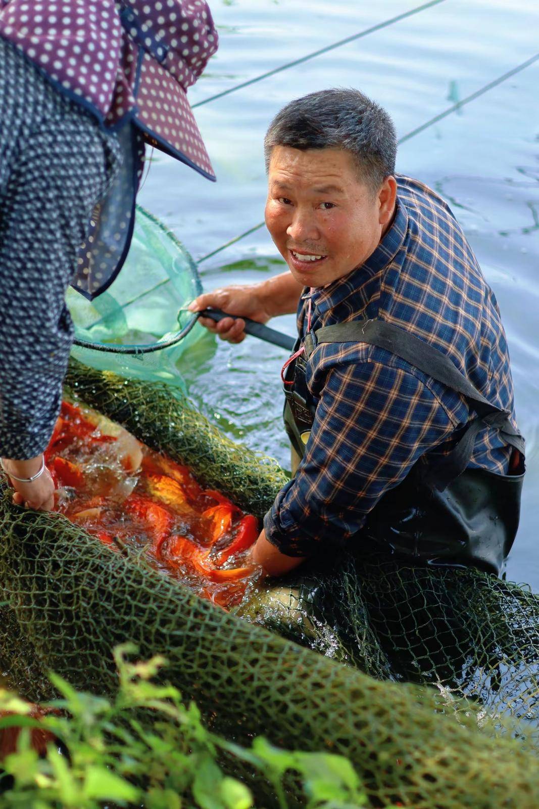 通讯员 陈鑫璇 摄 1999年,朱德强的亲家伯父黄年生开始与鱼塘为伴。那时信息闭塞,黄年生就买来专业书籍一本本啃,从门外汉成长为十里八乡有名的“土专家”。十余年摸索,终于趟出一条特色养殖路。2023年,黄年生年事已高,朱德强接过接力棒。 “观赏鱼和淡水鱼完全是两码事,养观赏鱼讲究的是品相,品相不同,价格能差出好几倍。”接手后,朱德强一边向黄年生请教传统经验,一边上网查资料、刷视频学习现代技术,还多次外出考察取经。从水质调控到病虫防治,从水花培苗到品种选育,几年下来,他不仅掌握了核心技术,还将品种从单一发展到红白、三色、孔雀等8个热门品种。 在观赏鱼行业,品相就是“通行证”。而品相的根基,在于水花培苗这一关键环节。“鱼苗从河南进货,长途运输后有应激反应,培苗期管不好,后面全是白费。”朱德强说。 为破解这一难题,他创新探索出“联动养殖”模式:由周边农户专职负责水花培苗,待鱼苗长到适宜规格,他再统一回收进行成鱼养殖。培苗塘与成鱼塘彻底分开,既避免了病害传播和抢食损耗,又实现了“一户带多户、抱团谋发展”的增收格局。