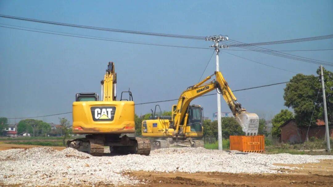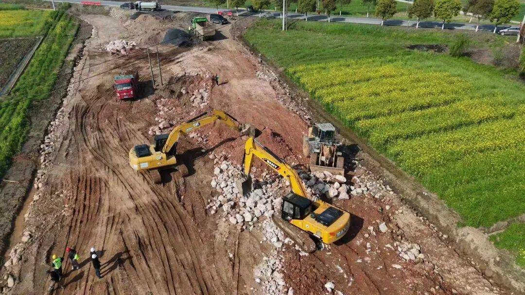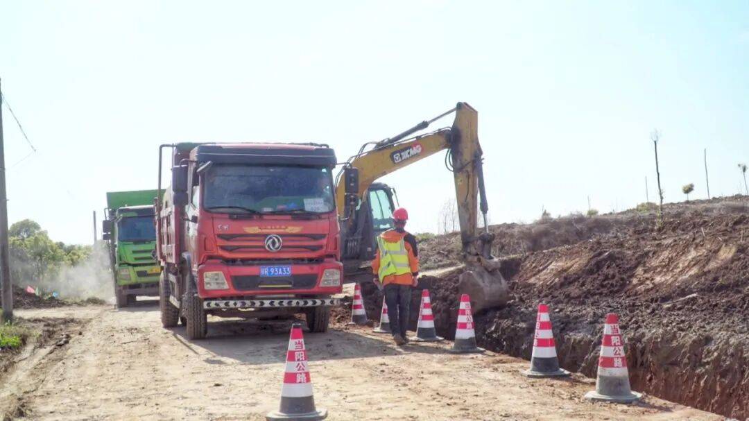 在河溶镇郭家场村与沙洋县交界处,刚开工的S342当阳市河溶至沙洋段公路改建工程正在加速推进,挖掘机正在进行路基清表作业,运输车辆往返运送土石方。