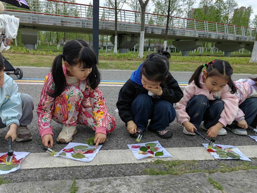 中一班的孩子们化身小小画家,开启了油菜花手指画创作之旅。老师先耐心地向孩子们讲解油菜花的外形特征与色彩特点,随后分发颜料与画纸,引导孩子们用灵巧的手指蘸取颜料,在画纸上轻轻点染、按压、勾勒。孩子们兴致勃勃,指尖在画纸上灵动跳跃,一朵朵鲜活可爱的油菜花渐渐绽放,每一幅作品都是孩子们眼中最美的春天;中二班的小朋友们则专注于手工风车制作,亲手打造属于自己的春日小美好。老师一步步示范风车的组装步骤,孩子们认真聆听、细心操作,并用彩笔进行装饰。不一会儿,一个个色彩鲜艳、造型别致的风车新鲜出炉。孩子们手持风车在草地上欢快奔跑,风车迎着春风呼呼转动,五彩的扇面与春日美景相映成趣,清脆的欢笑声在公园上空回荡;中三班开展的锤子砸染活动,更是充满了新奇与趣味。老师提前准备好画布和小锤子,和孩子们一起在公园捡拾花朵和树叶,为孩子们讲解砸染的操作方法。孩子们拿起小锤子,轻轻敲击铺有花朵和树叶的画布,花朵和树叶在画布上慢慢晕染、扩散,形成了独一无二、充满艺术感的画面。自由的创作形式充分释放了孩子们的想象力,让他们在轻松的游戏中感受艺术创作的乐趣。