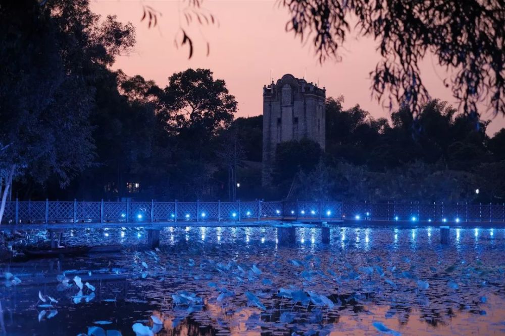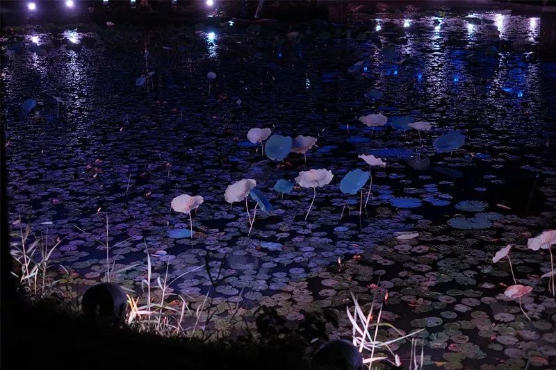 在彩灯的映照下,舞蹈演员身着汉服,荷塘木桥上翩翩起舞,为市民上演了一场光影+文化的视觉盛宴。