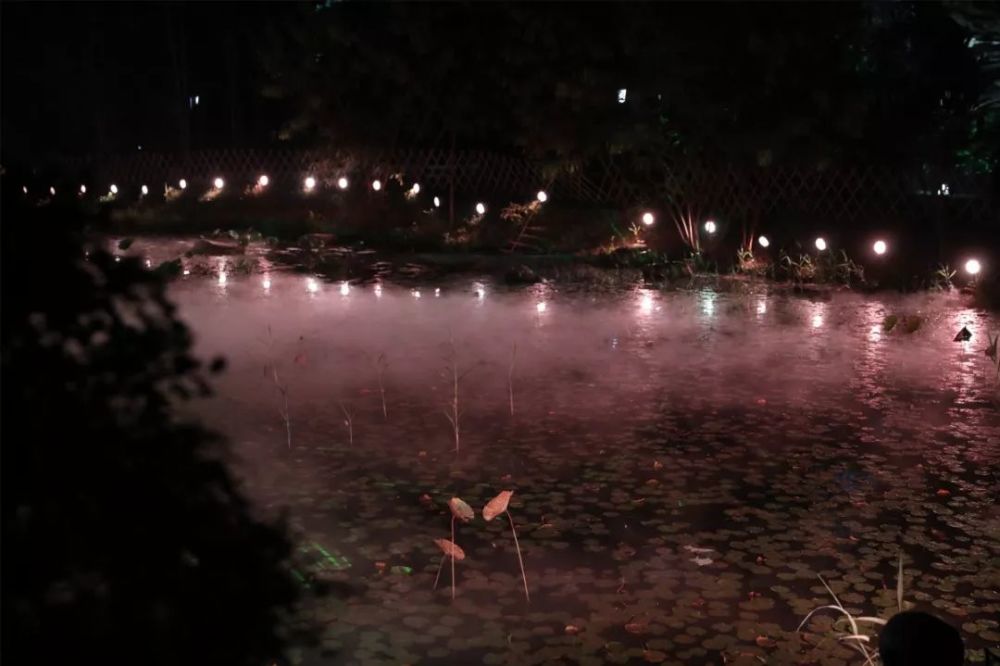 踏上云雾笼罩的小桥,荷塘中若隐若现的亮光。