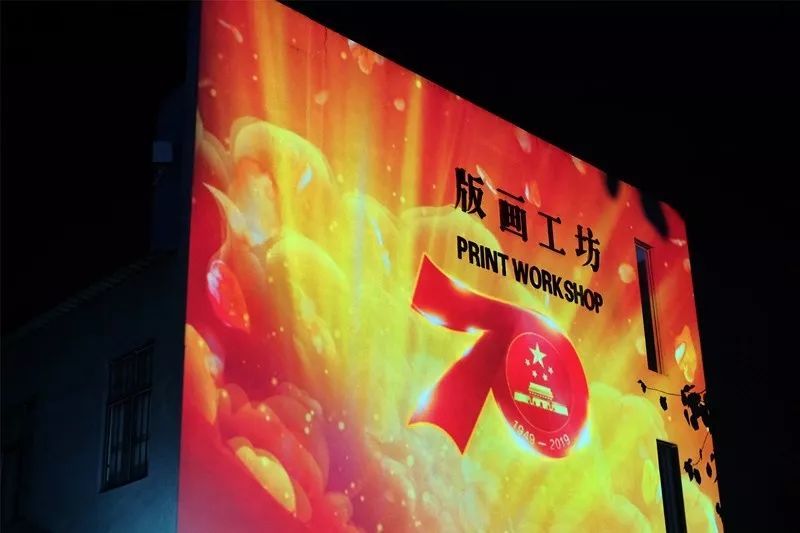 进入版画基地后,可以看到版画工坊外侧高墙上,以红、黄色光线组合出70、五星、天安门以及1949-2019等图案和字样。