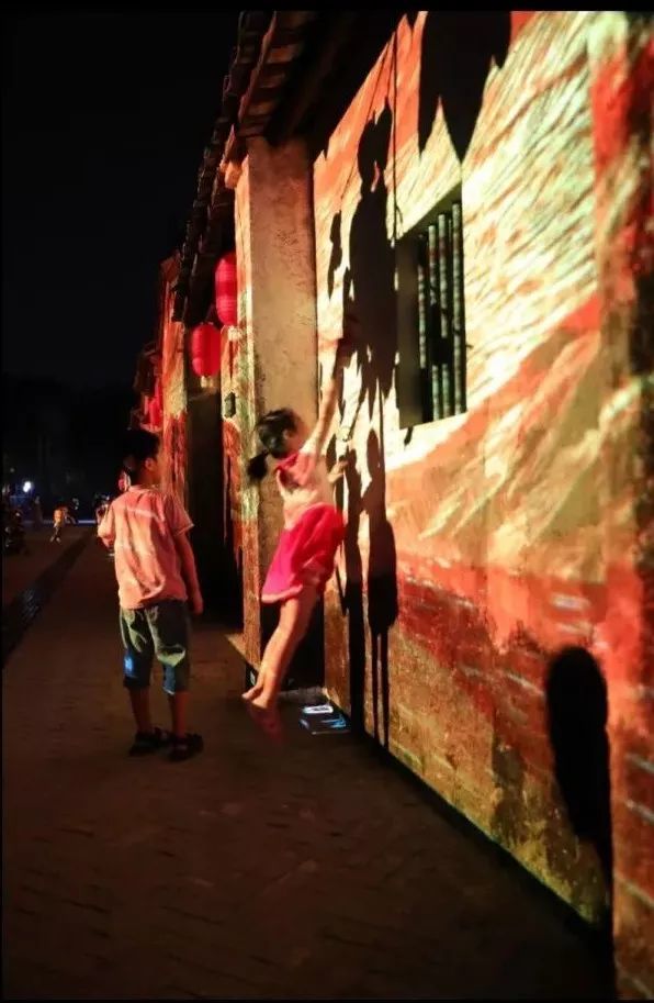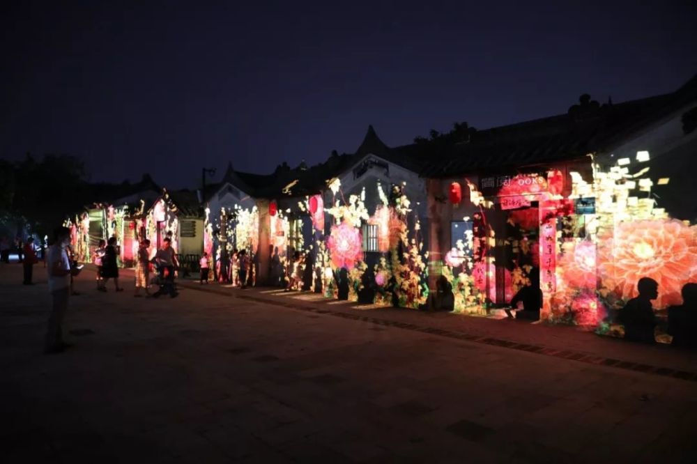夜色中,以古村落墙体为画布,转动的牡丹、跳动的小鹿,在上面铺展开来。
